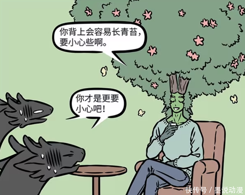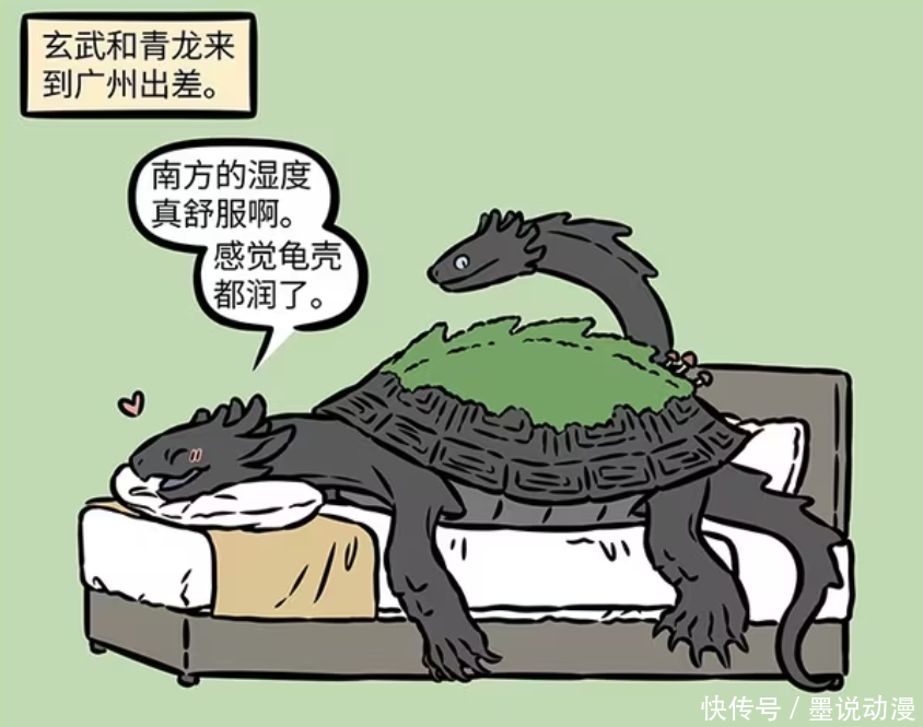 青龙告诉玄武,他们背上容易长青苔。然而反不雅青龙,那就不是背上长青苔那么粗拙。因为空气太过湿润,青龙也曾形成了一棵树,连体魄皆形成绿巨东说念主款式。此时青龙头顶还长出鲜花,致使蛊惑了蝴蝶过来。