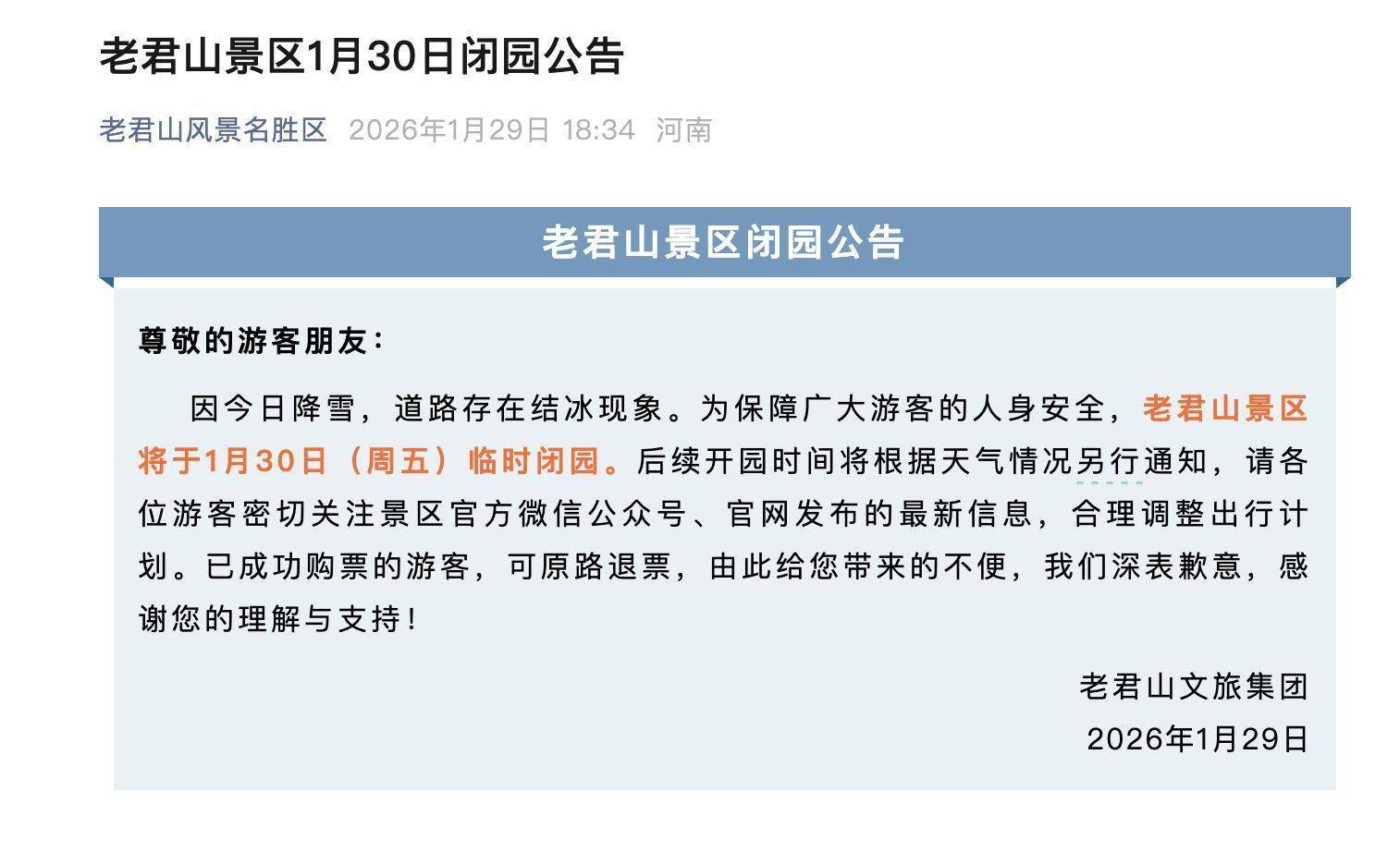 据老君山景区闭园公告,因当天降雪,说念路存在结冰风景。为保险广泛搭客的东说念主身安全,老君山景区将于1月30日(周五)临时闭园。后续开园本领将凭据天气情况另行见知,请列位搭客密切和顺景区官方微信公众号、官网发布的最新信息,合理调理出行沟通。已告捷购票的搭客,可原路退票。