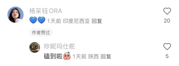 随后,杨采钰本东说念主就在酌量区留住两个蓝色爱心,老公也赞了杨采钰的留言,两东说念主大方公开互动秀恩爱,尽显甜密。不少网友看了两东说念主的互动王人示意“磕到了”。