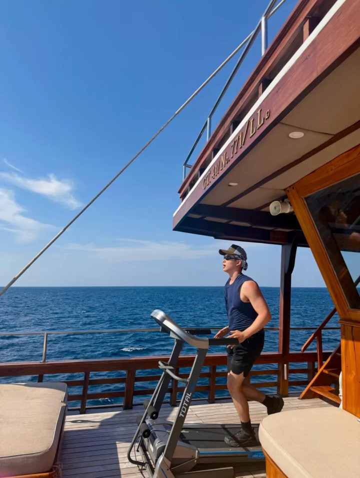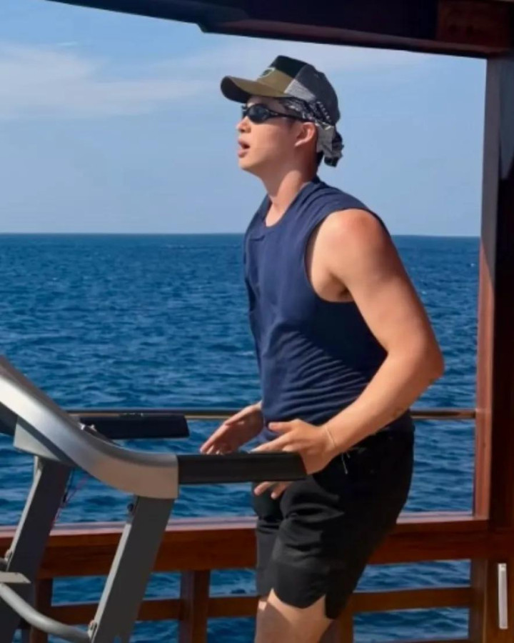 杨采钰老公还晒出一张在跑步机上跑步的相片,看来亦然自律又嗜好健身的大帅哥。他戴着帽子和墨镜,身穿蓝色背心和短裤,孤单通顺装尽显好身材,而从袒露的侧脸也能看到是容颜亦然相等帅气。