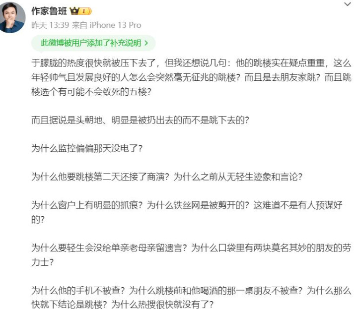 此前,作者鲁班也发文提议了14个质疑,直言“万般迹象齐标明这很可能是他杀”。