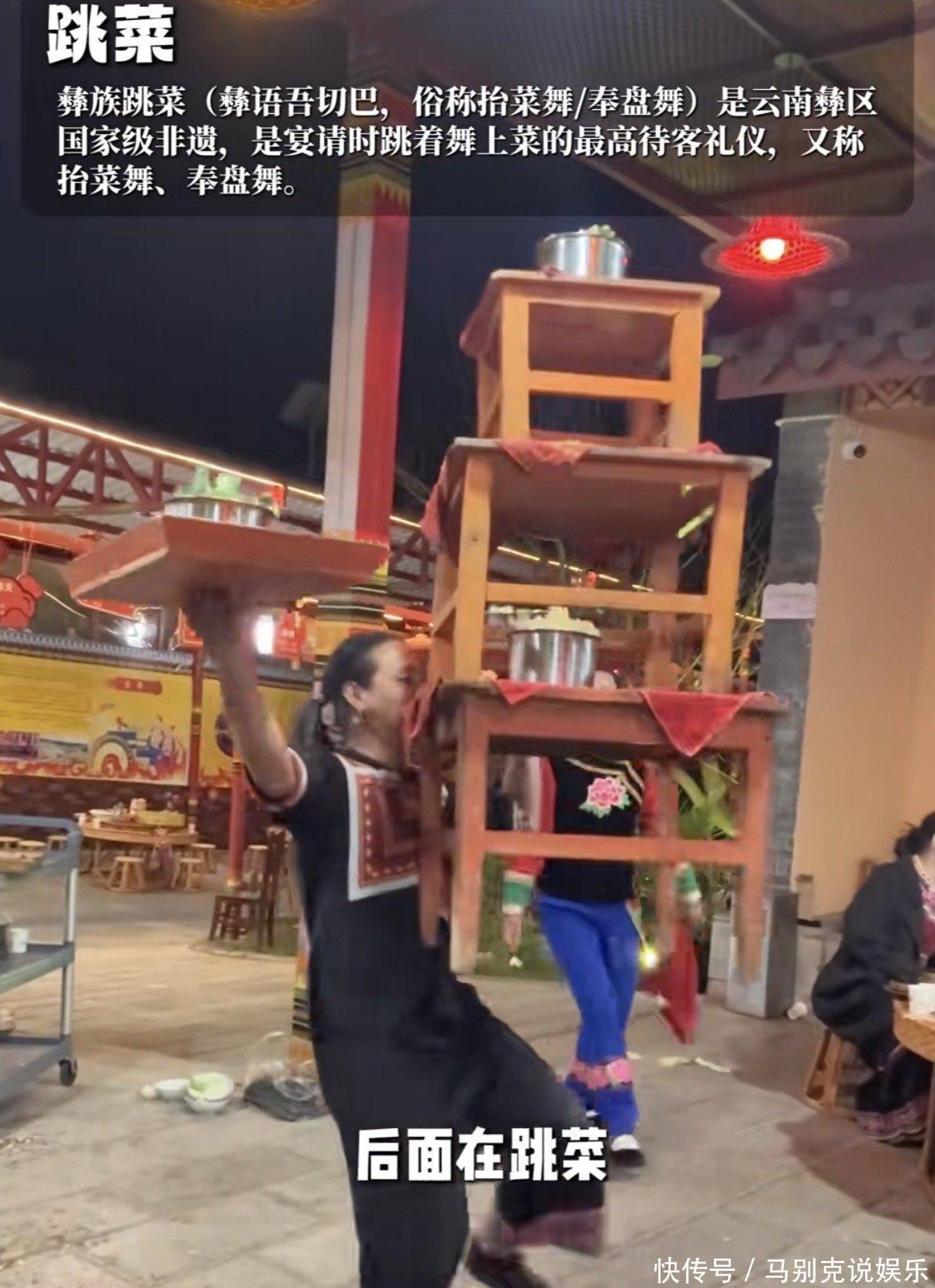 云南彝族地区有个国度级非遗风景叫跳菜,即是办宴席时边舞蹈边上菜。几张小桌叠起来摆满菜,托盘里也堆得高高的全是菜,这舞跳起来难度可真不小。