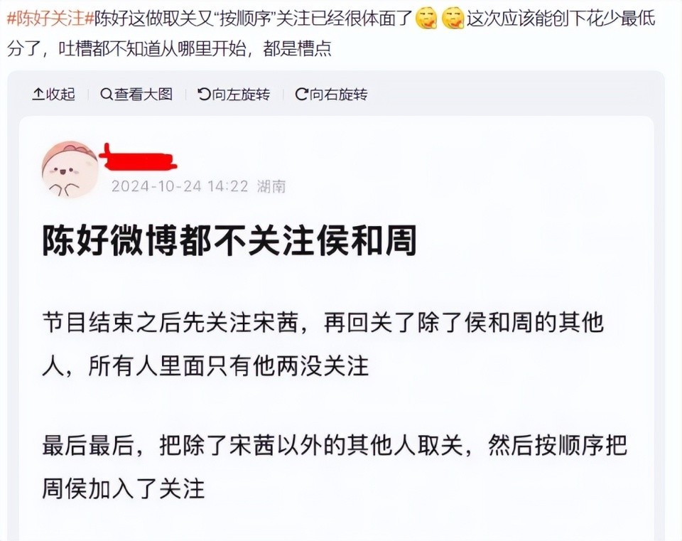 《花儿与少年6》正在热播,网友们扒出录制放置后,陈好先关怀宋茜,然后回关了除了周雨彤和侯明昊统统东谈主,临了又取消统统东谈主按照限定关怀了,这么的音尘出现,咱们只可说陈好简直是体面东谈主了。