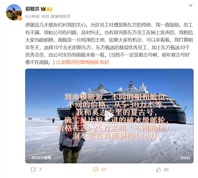 可令东说念主没念念到的是,俞敏洪在外交平台又接连发了10条南极游视频,骨子透顶是动物、船舶、冰川等。