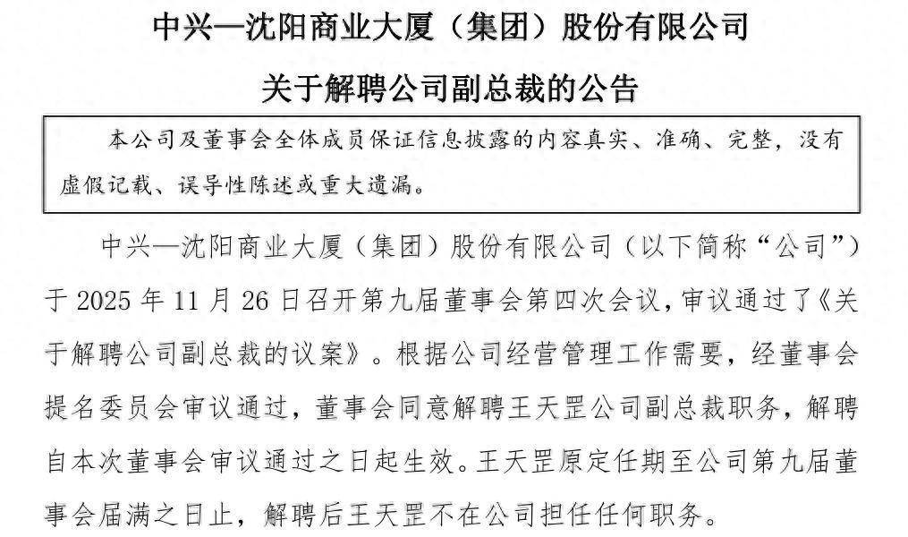 11月26日晚间,中兴买卖(000715)公告称,公司于26日召开第九届董事会第四次会议,审议通过了《对于解聘公司副总裁的议案》。凭据公司筹办惩处使命需要,经董事会提名委员会审议通过,董事会快活解聘王天罡公司副总裁职务,解聘自本次董事会审议通过之日起奏效。