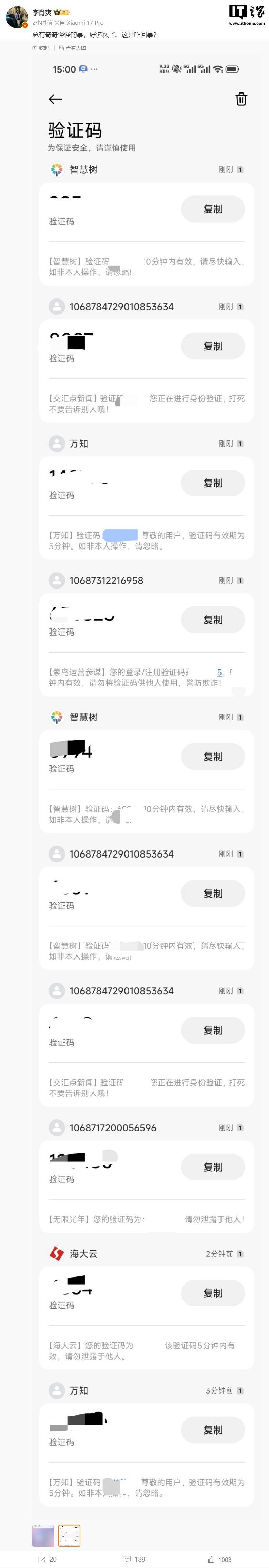 截图披露,其手机疑似遇到短信轰炸,在短短数分钟内禁受到数十条考据码。