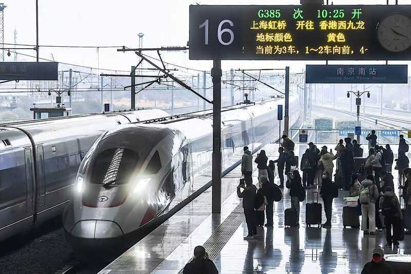 1月27日10时22分,G385次高铁列车抵达南京南站16号站台。手握颠倒站为“香港西九龙”车票的陆先生在站台留影,叹气谈:“以往赴港需乘坐飞机或转车,如今可乘高铁沿途向南,直抵维港之畔。”