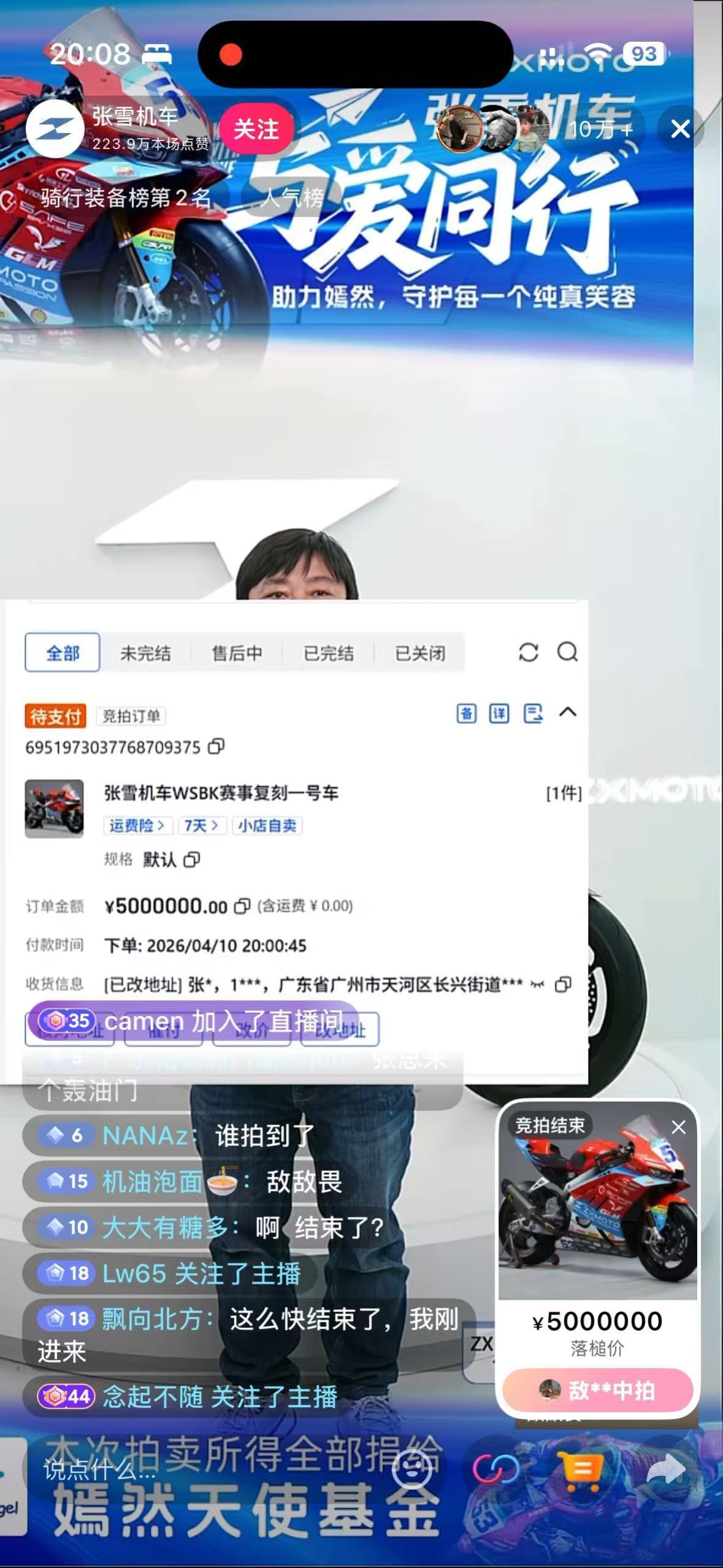 竞拍拍卖为止后,张雪与李亚鹏连线。李亚鹏说,他代表嫣然统统责任主谈主员向张雪暗示诚笃感谢,对他为中国摩托车作出的孝敬暗示至心祈福。张雪则回复,但愿李亚鹏监督每一分钱,不亏负统统东谈主对嫣然天神基金的信任。
